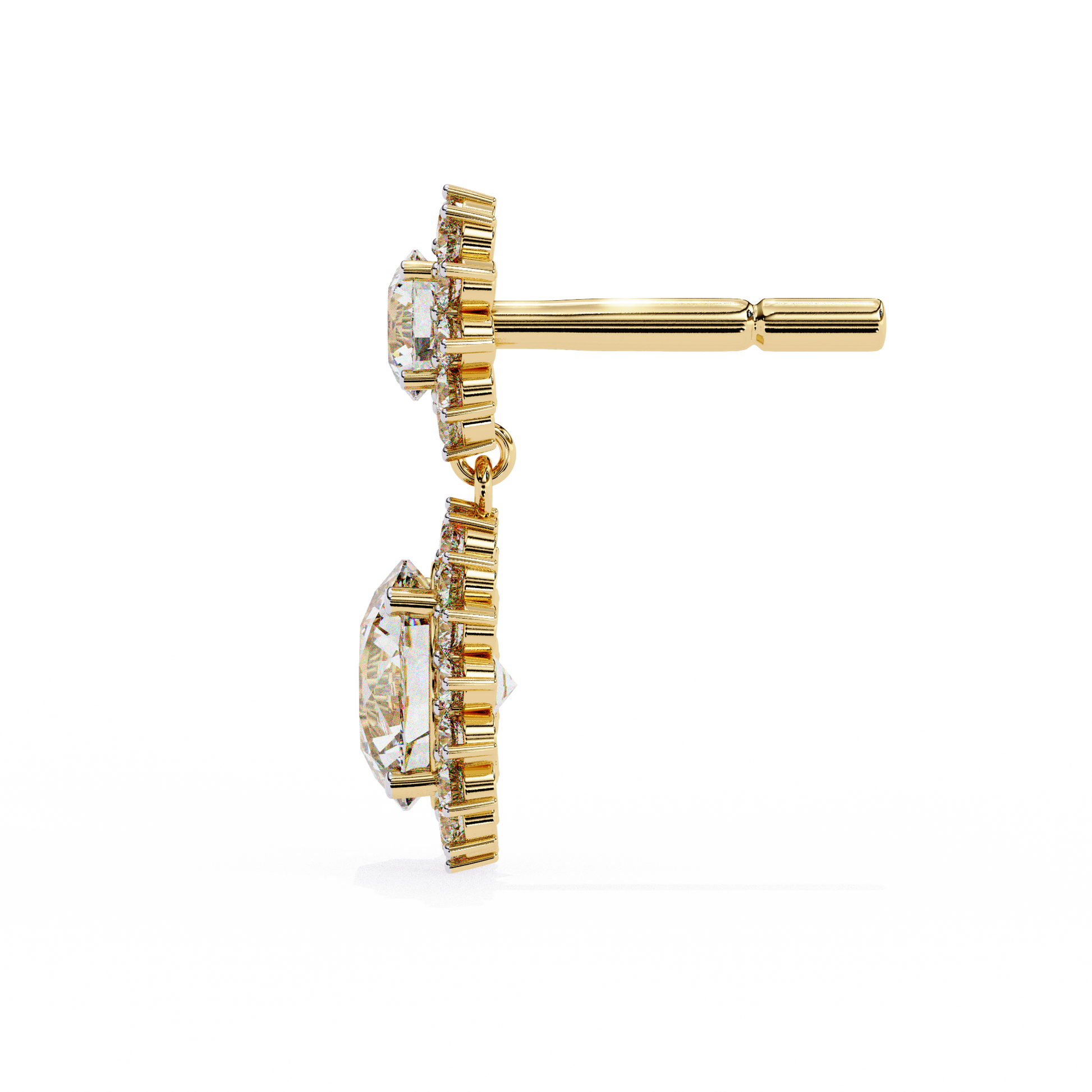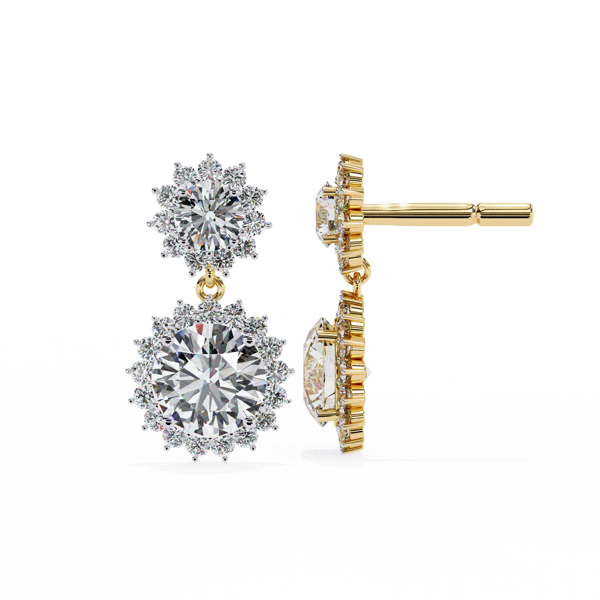 Graceful and timeless, these elegant flower-shaped 18k solid yellow gold drop earrings feature brilliant 1.37Ct round-cut lab-grown diamonds in an antique-inspired classic design. The dainty silhouette and sparkling details make them perfect for bridal wear, adding a romantic touch to the wedding day. A beautiful and meaningful gift that will be cherished for years to come.