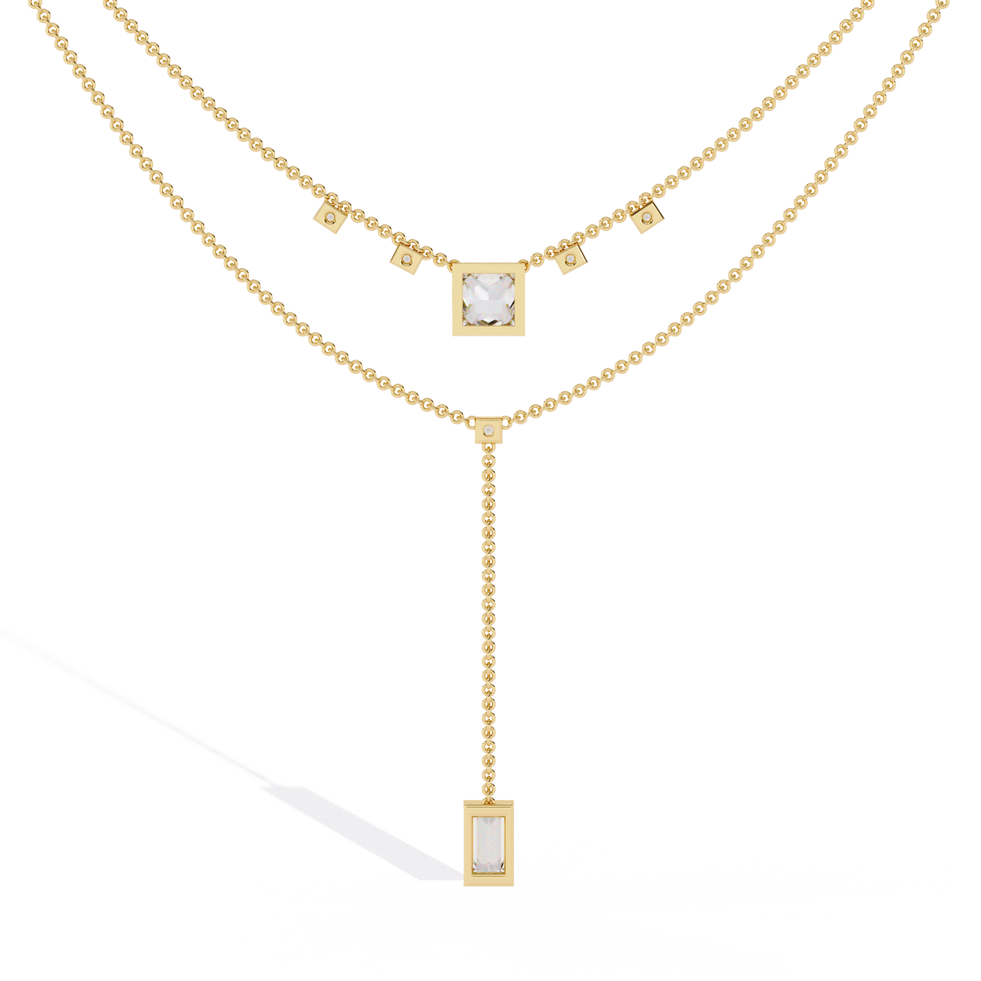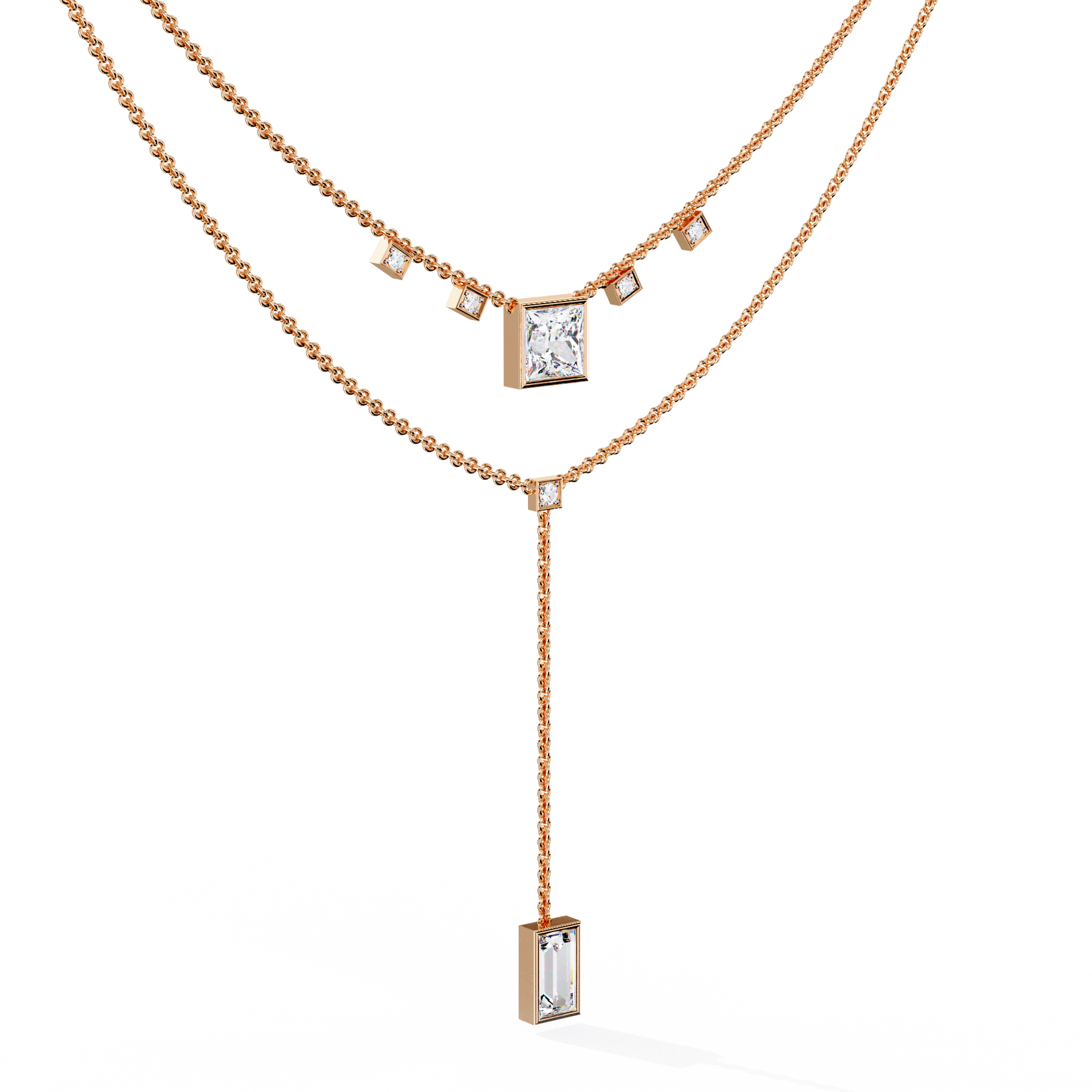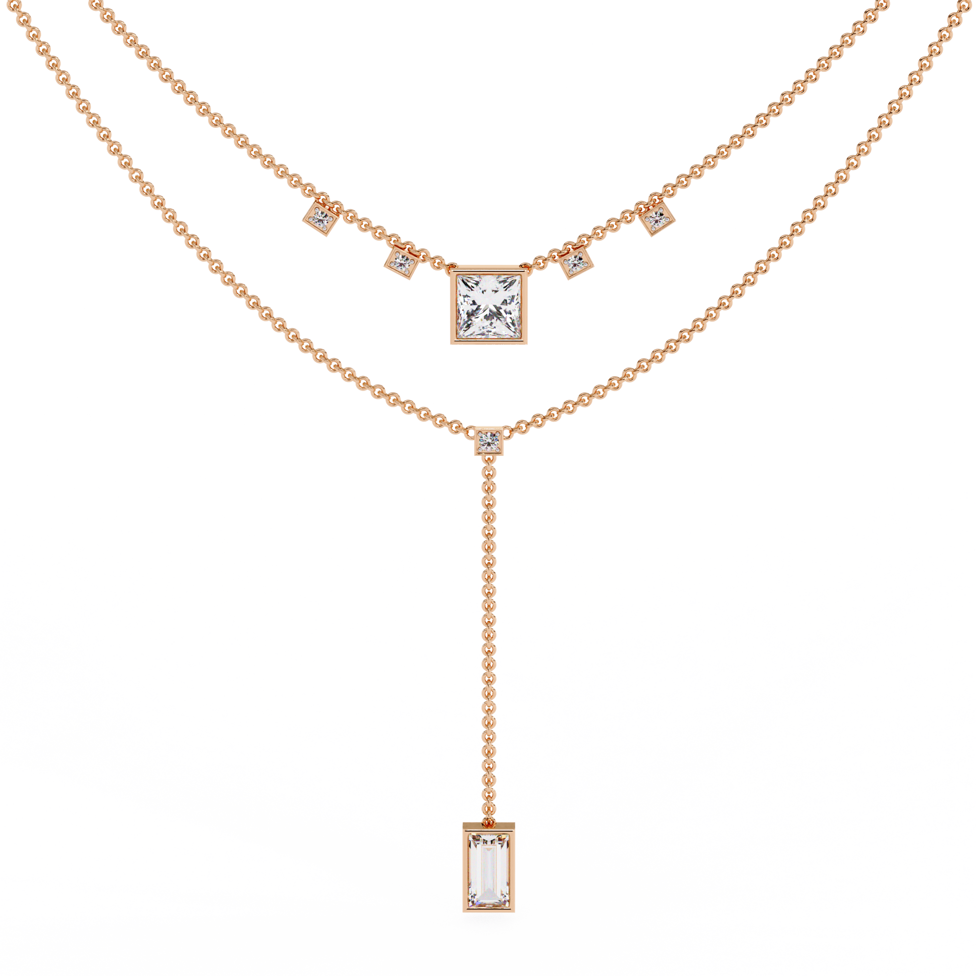 Add a touch of elegance to your bridal look with this dainty diamond necklace featuring a stunning 3.44 Ct lab-grown diamond in princess and round cut, set in 14k solid rose gold bezel. Perfect as a gift for your princess on her special day.
