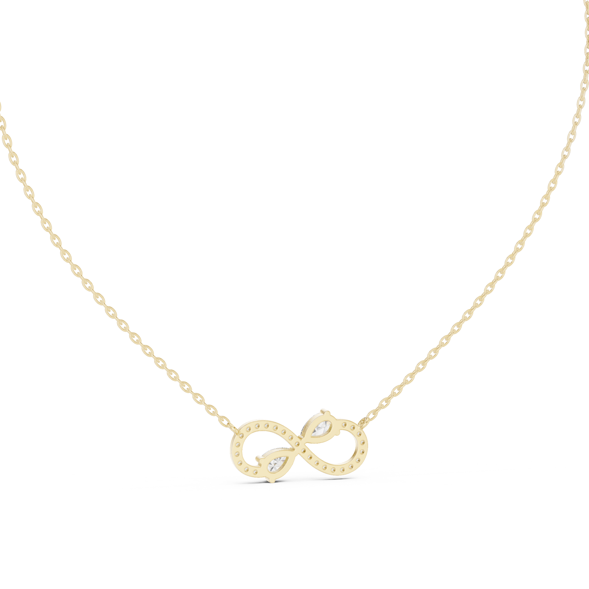 Celebrate endless beauty with this Round & Pear Shape Infinity Diamond Pendant, exquisitely crafted in 14K Solid White Gold. Designed in a graceful infinity style, this pendant symbolizes eternal love and elegance. The combination of round and pear-cut diamonds adds a radiant sparkle that enhances its luxurious appeal. Perfect for daily wear or gifting, this pendant is a timeless expression of sophistication and charm, making it a must-have addition to her jewelry collection.