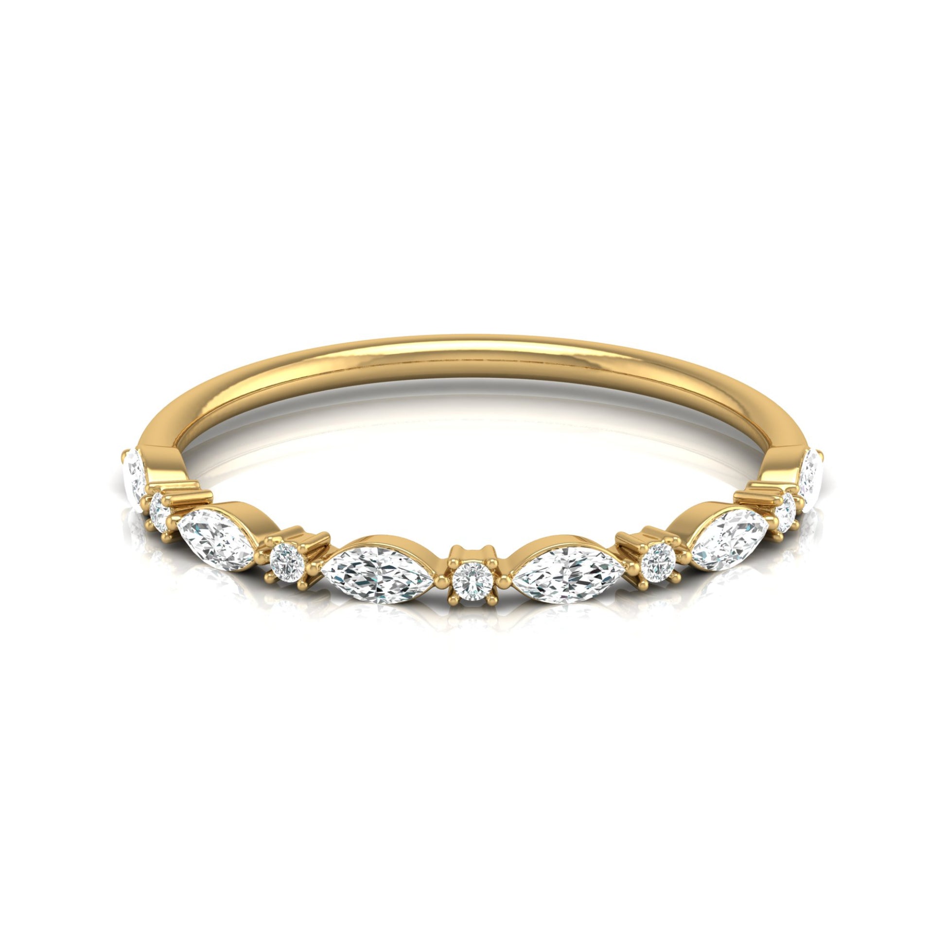 Enhance your jewelry collection with this exquisite stackable ring band, showcasing a beautiful combination of marquise and round cut diamonds that create a stunning, intricate pattern. Crafted with precision, Available in high-quality gold plating options of and 18KT, and featuring your choice of natural or lab-grown diamonds, this ring is perfect for stacking or wearing alone for a refined look.